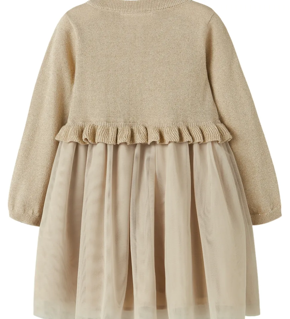 Elegant Name It kjole i en smuk beige nuance. Kjolen har lange ærmer og en overdel med en strikket struktur og med glimmer, der komplementeres af et skørt af tyl. Flæsedetaljen ved taljen giver et flot udtryk. Name It kjolen fremstår med en rund halsudskæring.