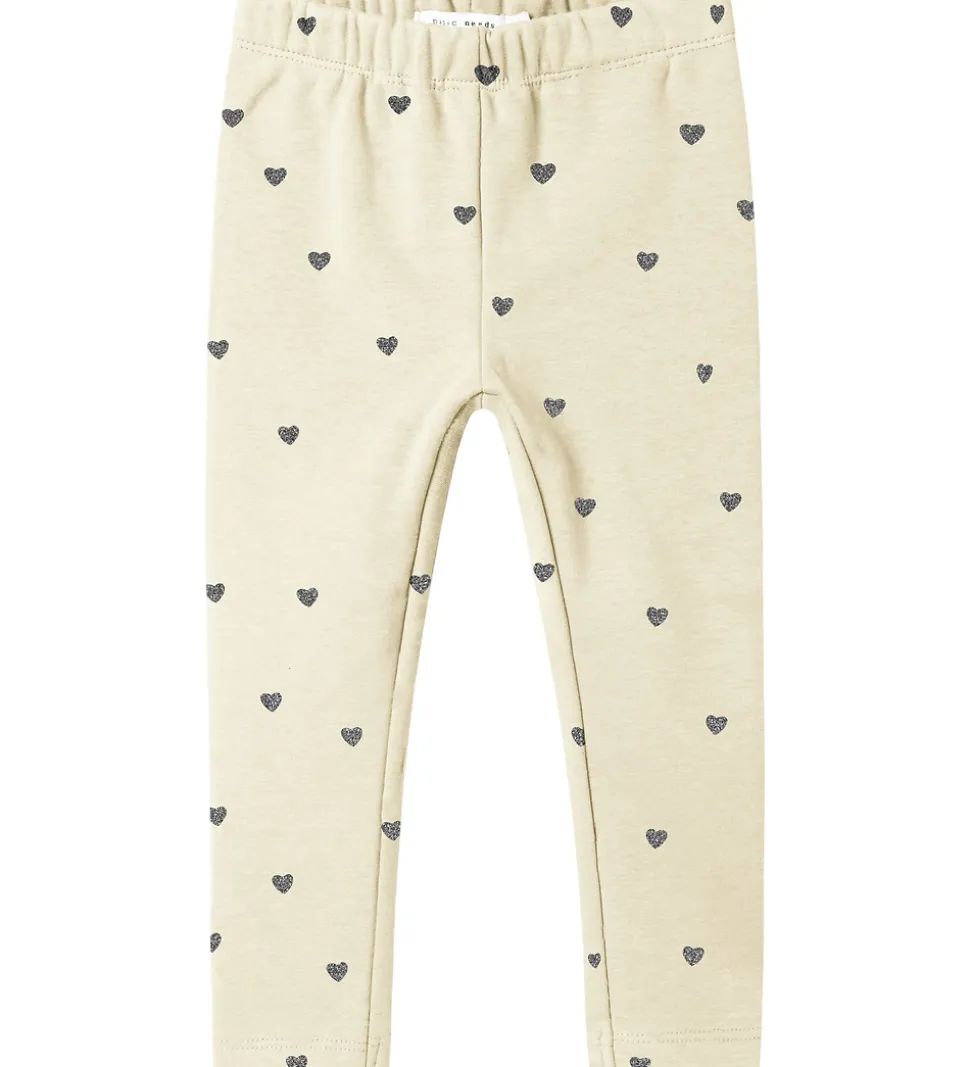 Skønne Name It leggings i en lys beige farve med små, sølvfarvede hjerter med glimmer. Name It leggingsene har en elastisk talje, der sikrer en behagelig pasform, og på indersiden har de blødt fleece.