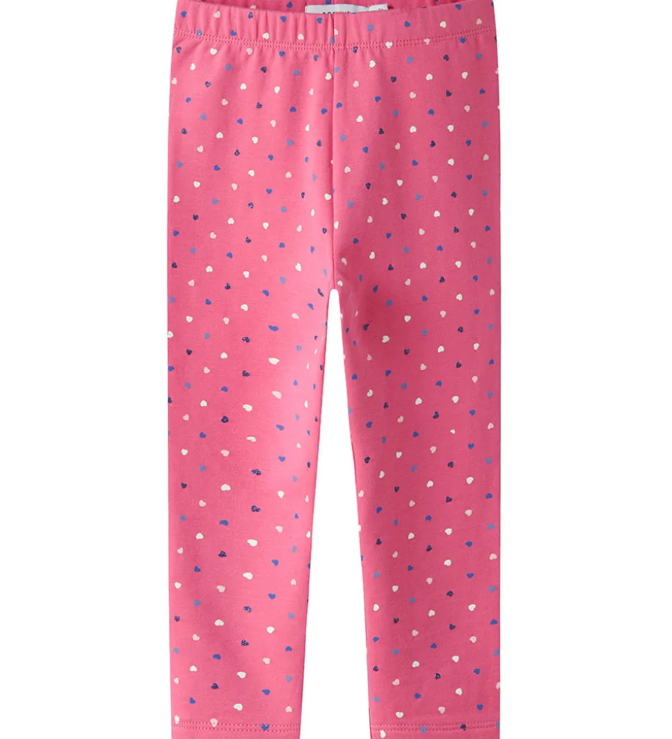 Farverige Name It leggings i pink med et alloverprint af små hjerter i hvide og blå nuancer med glimmer. Name It leggingsene har en elastik i taljen og en blød, børstet inderside.