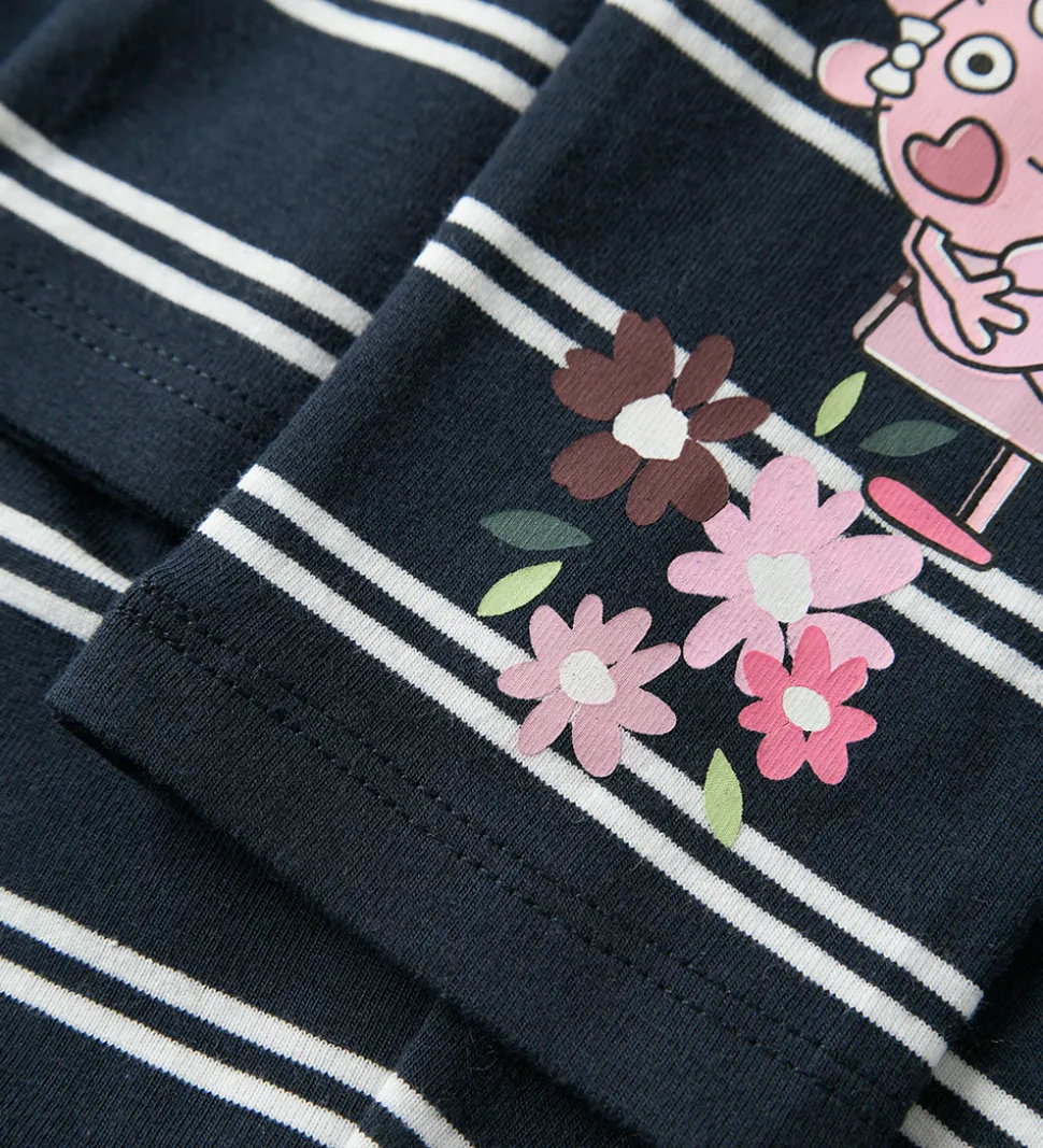 Skønne Name It leggings i navyblå med vandrette, hvide striber og et print af to Gurli Gris karakterer og blomster på venstre ben. Name It leggingsene har en elastisk talje og en tætsiddende pasform.
