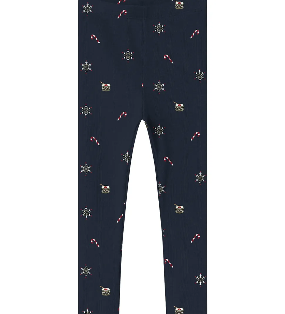 Smarte Name It leggings i navyblå med et alloverprint af små julemotiver. Leggingsene har ribstruktur og en elastisk talje, som giver en behagelig pasform.