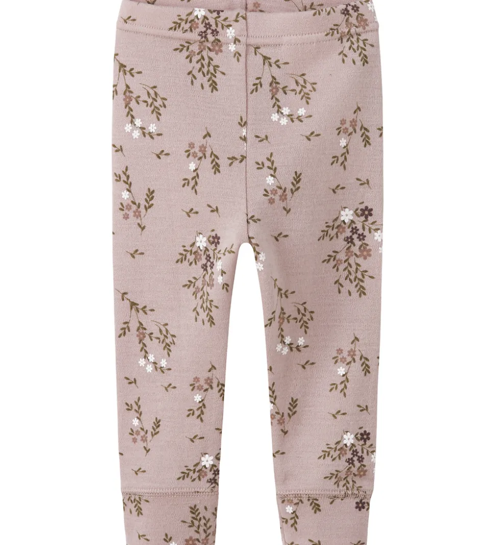 Skønne Name It leggings i støvet lyselilla med blomsterprint i grønne, hvide og lilla nuancer. Name It leggingsene har elastik i taljen, og brede kanter ved anklerne, som sikrer en god pasform. Legginsene er fremstillet af merinould.