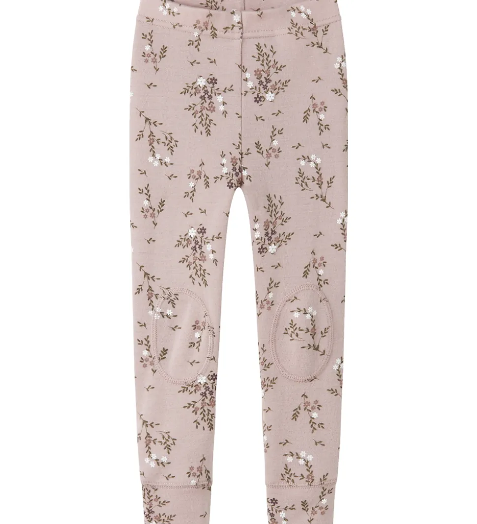 Flotte Name It leggings i støvet lyselilla med blomsterprint i grønne, hvide og lilla nuancer. Name It leggingsene har elastik i taljen, og brede kanter ved anklerne, som sikrer en god pasform. Ved knæene er der et ekstra lag stof, som gør legginsene ekstra slidstærke. Legginsene er fremstillet af merinould.