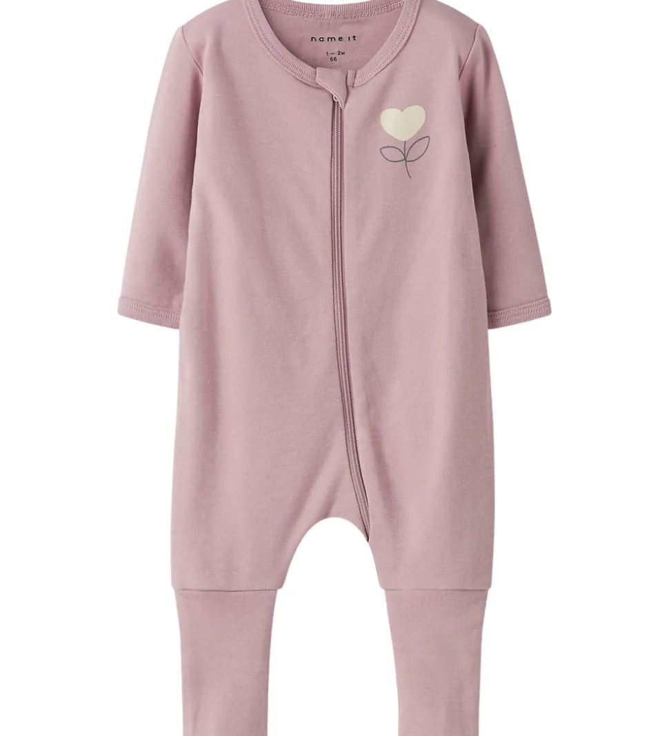 - Støvet rosa med print af en blomst med er hjerte på toppen i beige på venstre bryst.