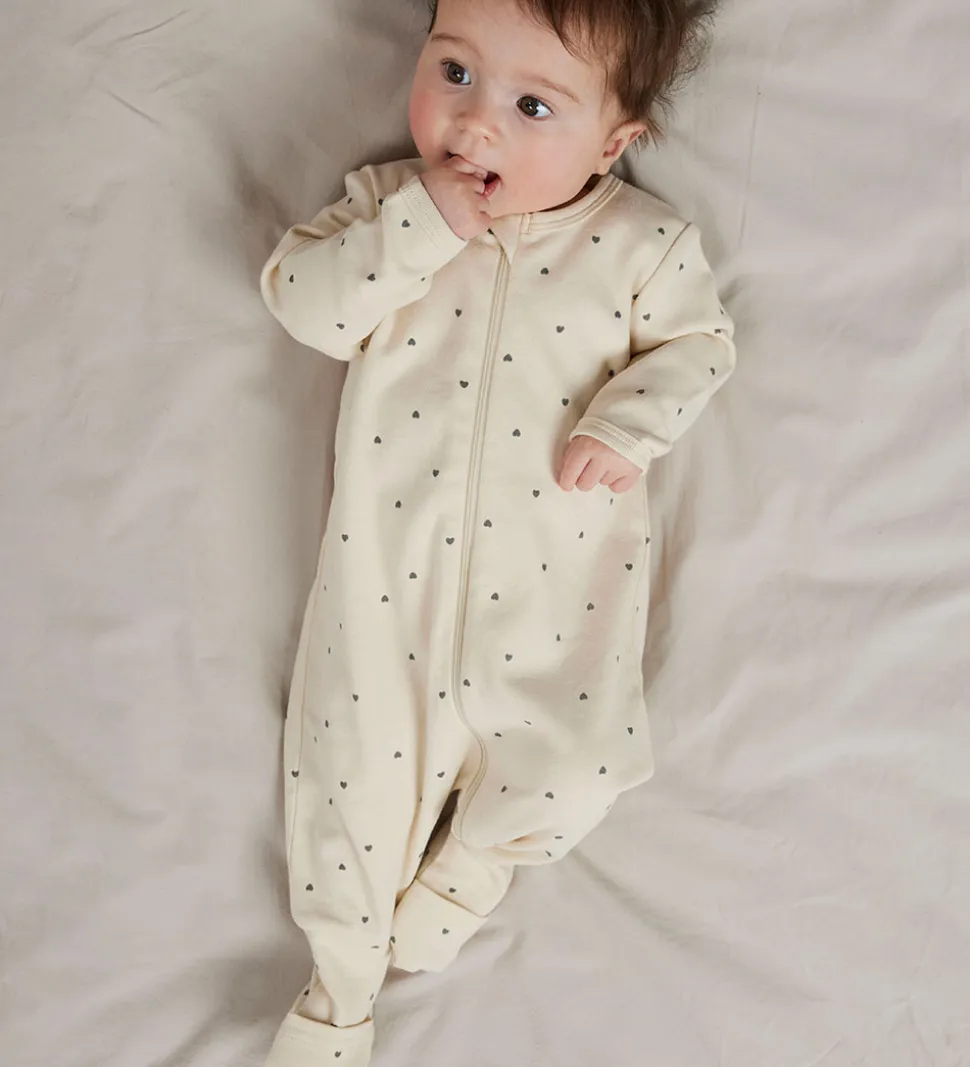 Natdragterne lukkes fortil med en lynlås med hagebeskytter og indvendig vindstolpe. Natdragterne har en rund halsudskæring, lange ærmer og lange med ben, med mulighed for ombuk til lukkede fødder.