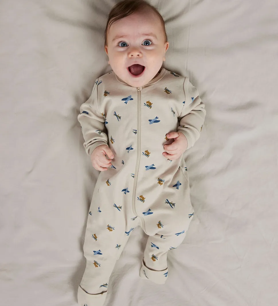 Natdragterne lukkes fortil med en lynlås med hagebeskytter og indvendig vindstolpe. Natdragterne har en rund halsudskæring, lange ærmer og lange med ben, med mulighed for ombuk til lukkede fødder.