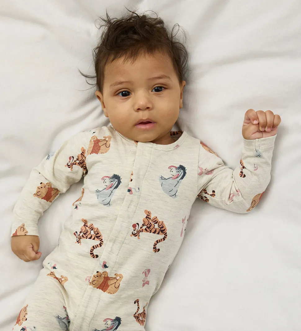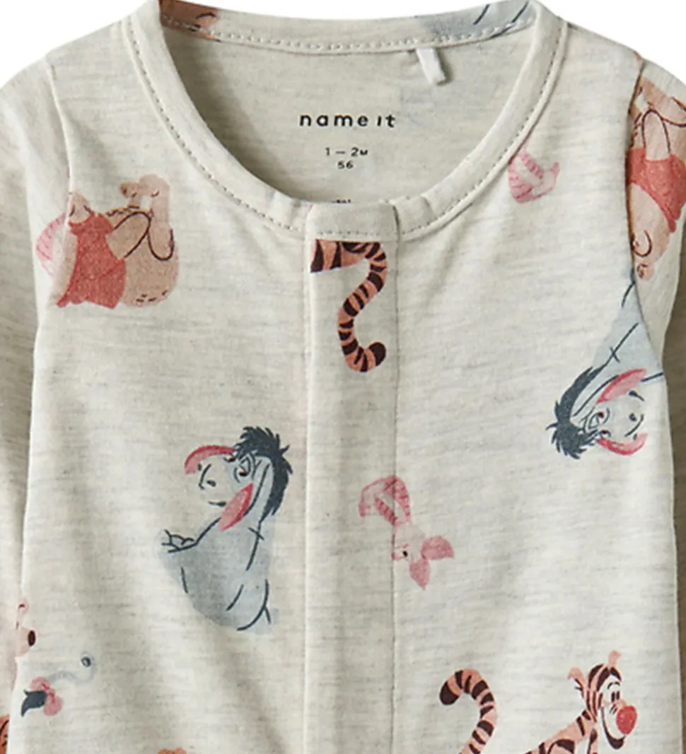 Charmerende natdragt fra Name It i gråmeleret med et alloverprint af Disney-karakterer fra Peter Plys. Natdragten har trykknapper fra hagen til venstre ankel. Den har lange arme og lange ben med brede kanter i benåbningerne.