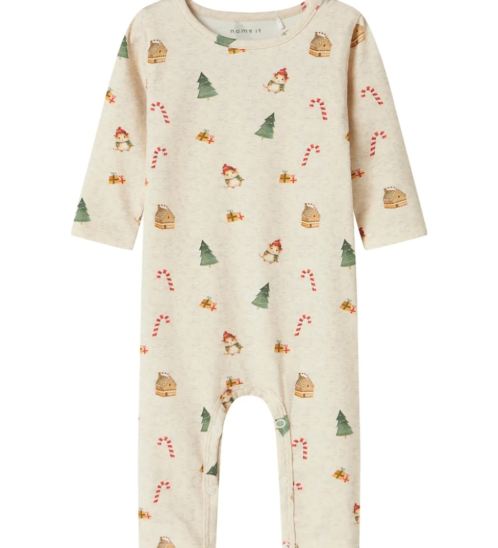 Charmende Name It natdragt i en lys meleret beige nuance. Natdragten er dekoreret med et festligt mønster af juletræer, slikstokke, gaver og andre julemotiver. Natdragten har en rund halsudskæring med tryknapper ved venstre skulder og lange ærmer. Den lukkes mellem benene med trykknapper.