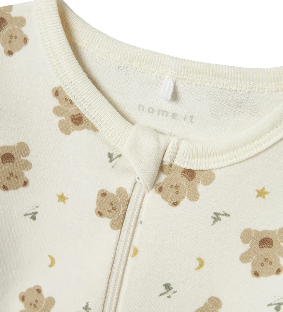 Name It natdragterne har lange ærmer med smalle ribkanter og lange ben med praktiske ombuk. Natdragtene åbnes fortil med en lynlås fra halsåbningen ned ad fronten og ned ad venstre ben.