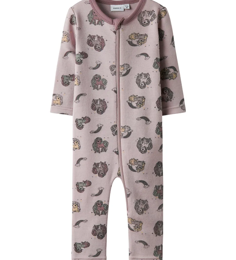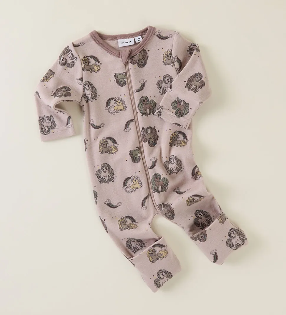 Charmerende Name It natdragt i støvet rosa med print af enhjørninger og regnbuer i forskellige farver. Natdragten åbnes med en praktisk lynlås fra hagen til venstre knæ. Lynlåsen har indvendig vindstolpe og hagebeskytter. Natdragten har en rund halsudskæring og lange ærmer. Den har lange ben med ombuk til lukkede fødder. Natdragten er fremstillet af 100% merinould.