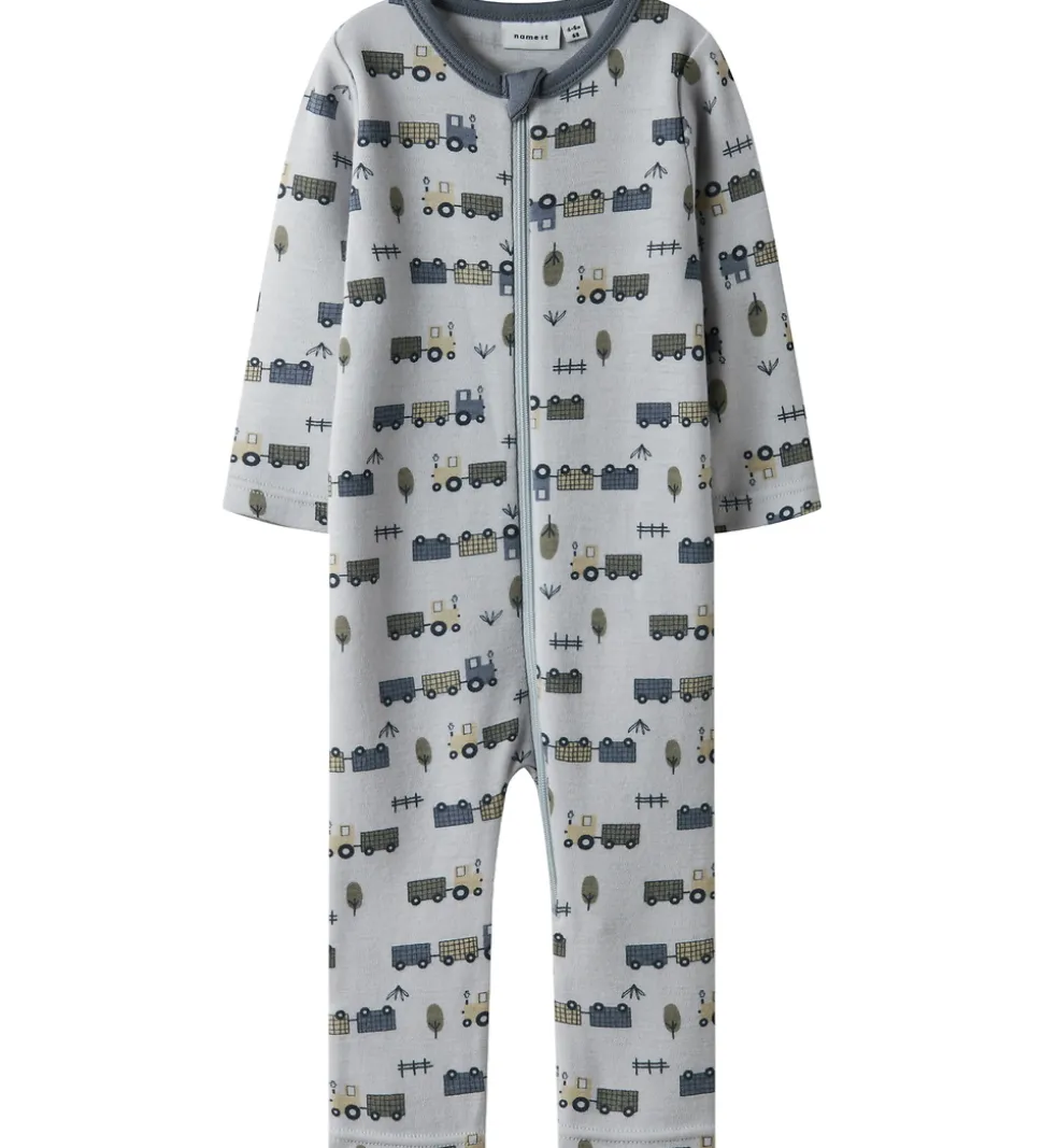 Charmerende Name It natdragt i en lys blågrå nuance med et alloverprint af traktorer med vogne og træer. Natdragten åbnes med en praktisk lynlås fra hagen til venstre knæ. Lynlåsen har indvendig vindstolpe og hagebeskytter. Natdragten har en rund halsudskæring og lange ærmer. Den har lange ben med ombuk til lukkede fødder. Natdragten er fremstillet af 100% merinould.