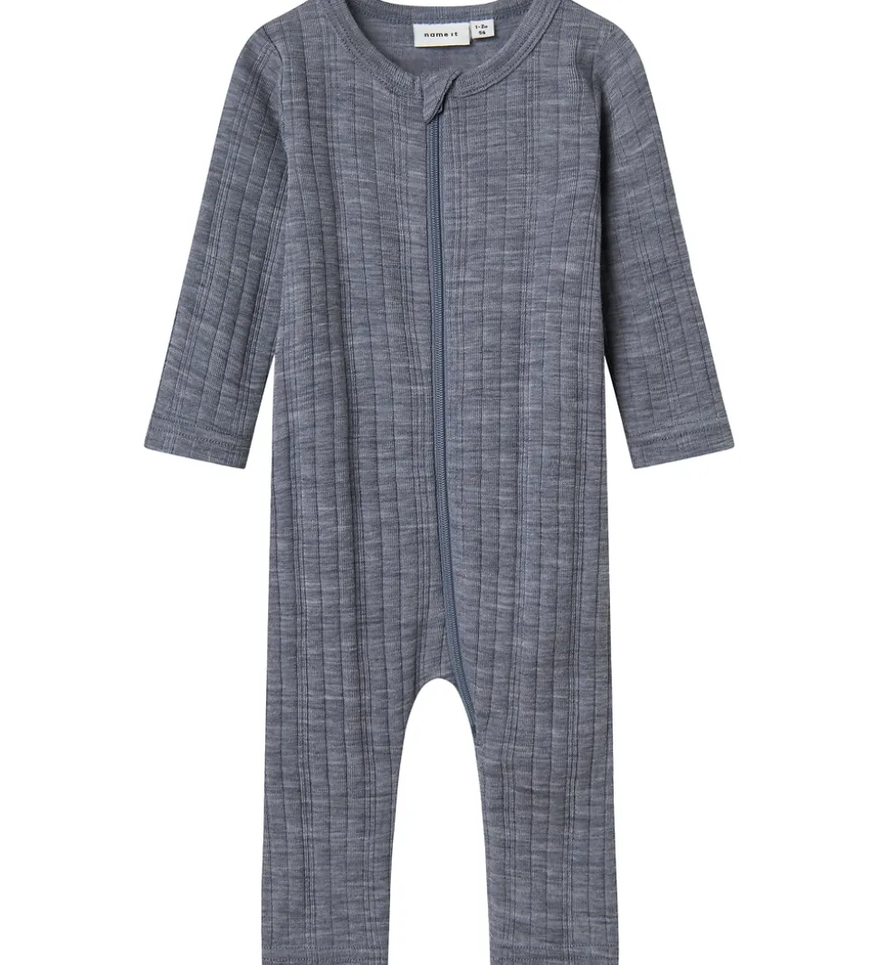 Stilfuld Name It natdragt i en klassisk gråblå med et enkelt ribbet mønster. Natdragten er designet med en praktisk lynlås med hagebeskytter, hvilket gør den nem at tage af og på. Den har lange ærmer og er perfekt til at holde dit barn varmt i de kølige nætter. Natdragten er fremstillet af lækkert merinould.