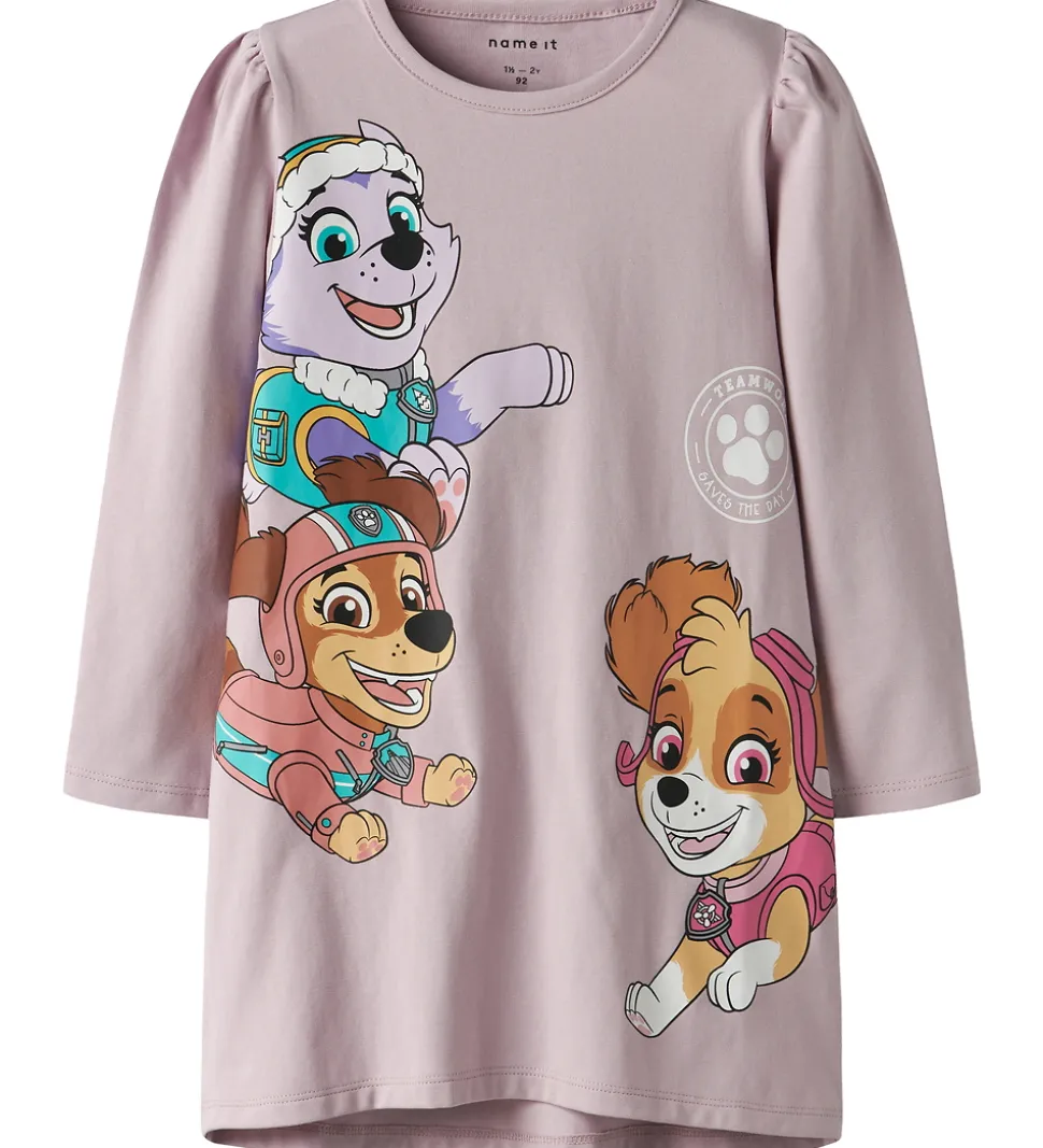 Farverig Name It natkjole i rosa med print af tre karakterer fra Paw Patrol. Natkjolen har en rund halsudskæring og lange ærmer med rynker ved skuldrene. Pasformen er løs og behagelig.