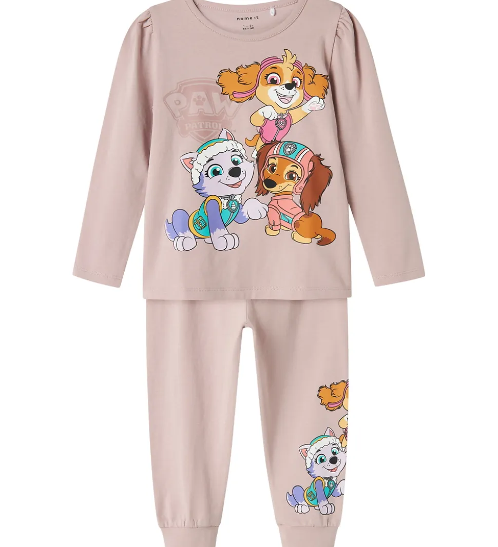 Charmende Name It nattøj bestående af en natbluse og et par natbukser i støvet rosa med print af figurer fra Paw Patrol.