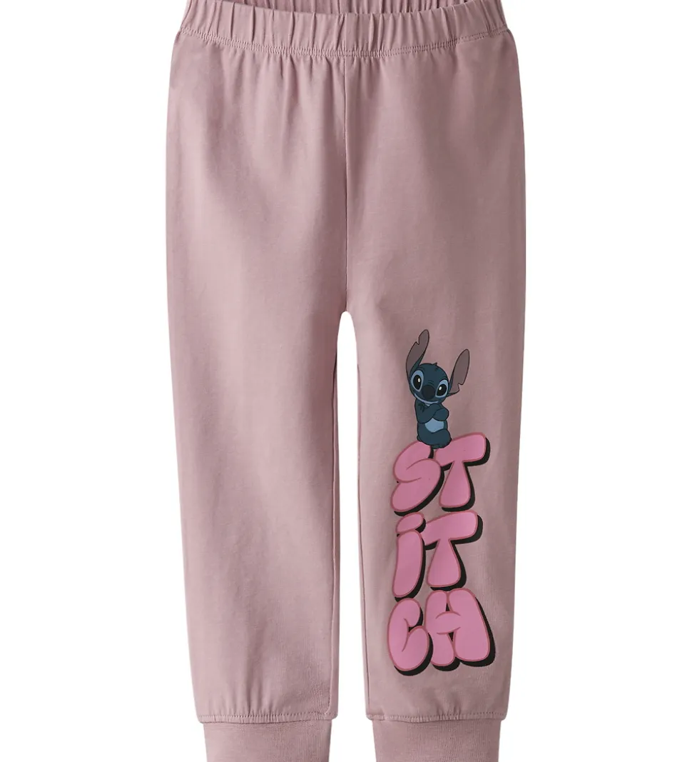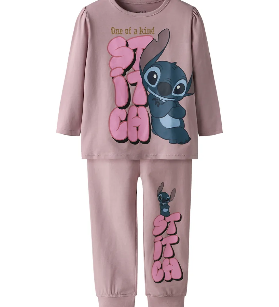 Skønt Name It nattøj i støvet lyselilla med et stort print på maven og venstre ben af Stitch. Nattøjet består af en natbluse med pufærmer og et par natbukser med lange ben og elastik i taljen.