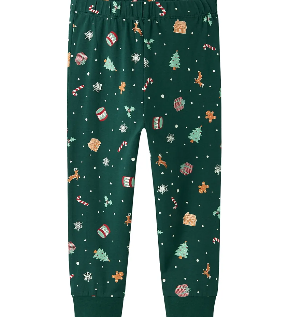 Smart Name It nattøj bestående af en natbluse og et par natbukser i mørkegrøn med alloverprint af julemotiver. Natblusen har en rund halsudskæring med en smal ribkant og lange ærmer. Natbukserne har en god elastik i taljen, og i benåbningerne er der brede ribkanter.