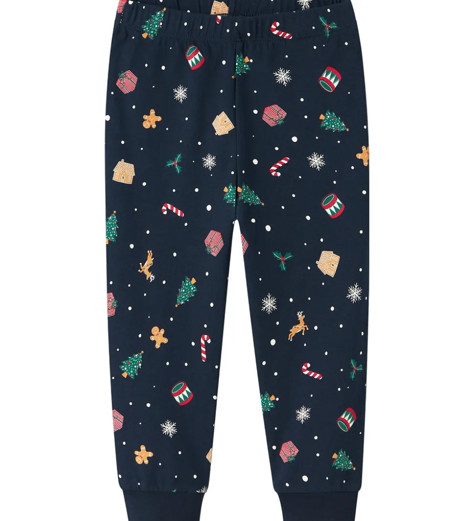 Skønt Name It nattøj bestående af en natbluse og et par natbukser i navyblå med alloverprint af julemotiver. Natblusen har en rund halsudskæring med en smal ribkant og lange ærmer. Natbukserne har en god elastik i taljen, og i benåbningerne er der brede ribkanter.