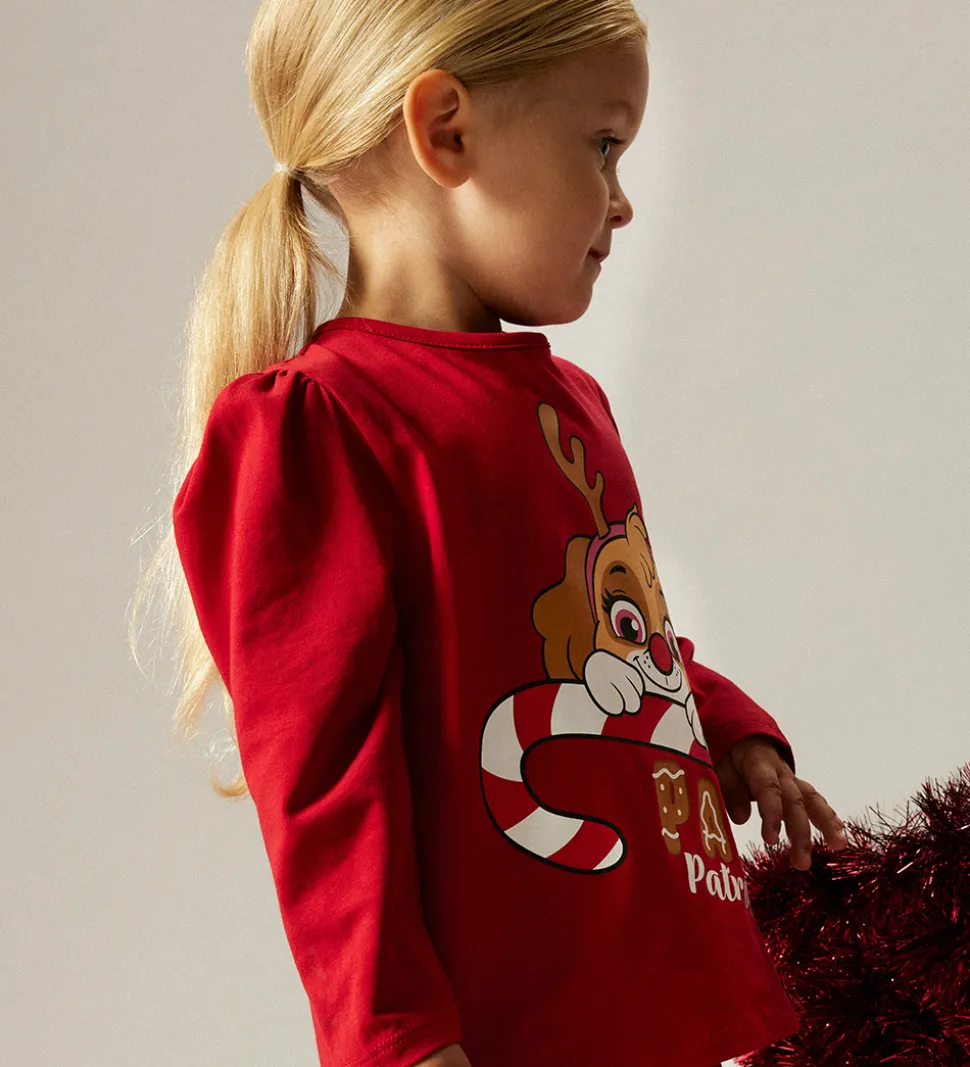 Fint Name It nattøj i rød bestående af en natbluse og et par natbukser med Paw Patrol juleprint. Natblusen har en rund halsudskæring og lange ærmer. Natbukserne har ribstruktur og en behagelig elastik i taljen.