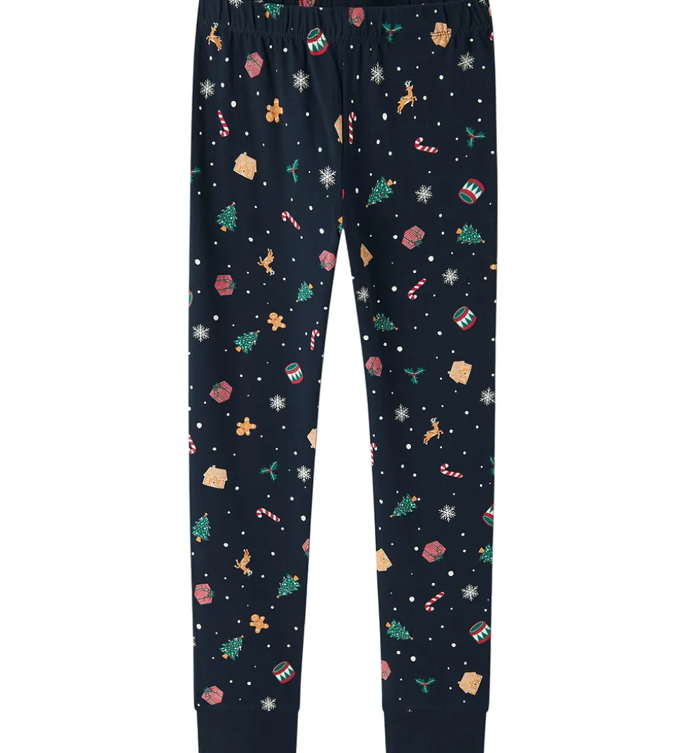 Skønt Name It nattøj i navyblå med et alloverprint af julemotiver. Nattøjet består af en langærmet natbluse og et par natbukser med elastik i taljen og ribkanter ved anklerne.