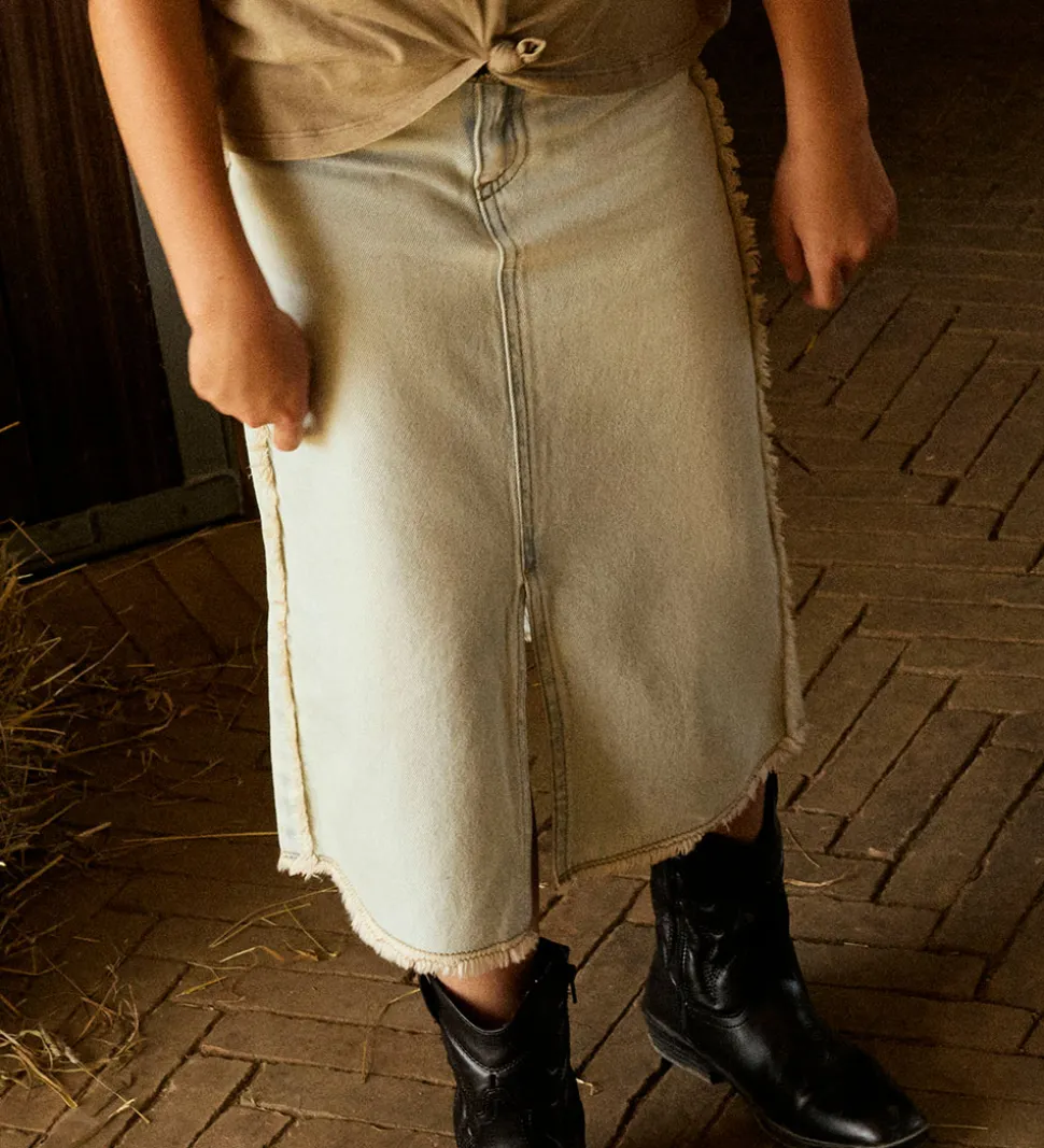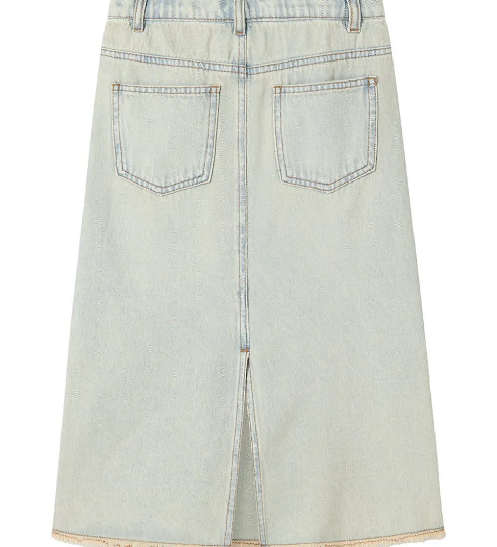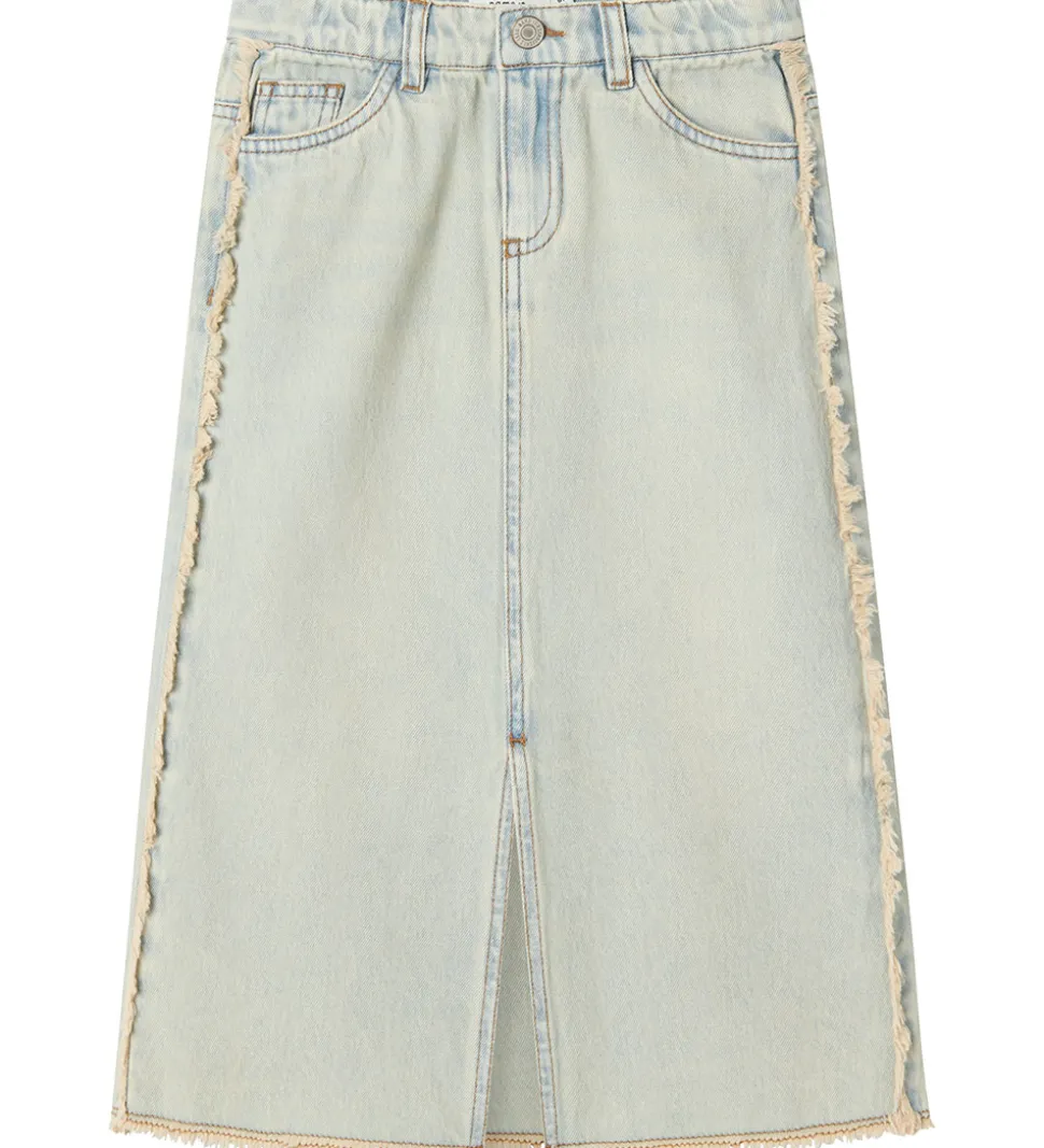 Elegant Name It nederdel i en lys denimfarve med frynser på sidderne. Name It nederdelen har et klassisk design med lommer og en slids foran, der giver et tidløst look.