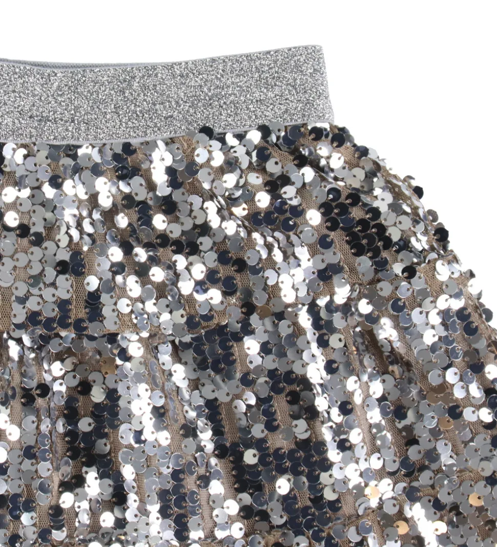 Flot Name It nederdel med palietter i sølv. Name It nederdelen har en elastisk talje i sølv glimmer, der sikrer en god og fleksibel pasform.