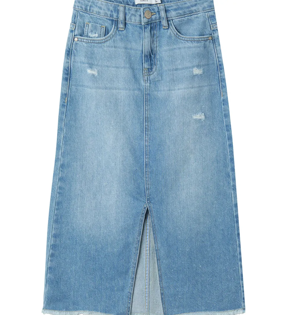 Stilrene Name It nederdel i en lyseblå denim med slidte detaljer og en klippede kant, som giver et trendy look, ideelt til den moderne garderobe.