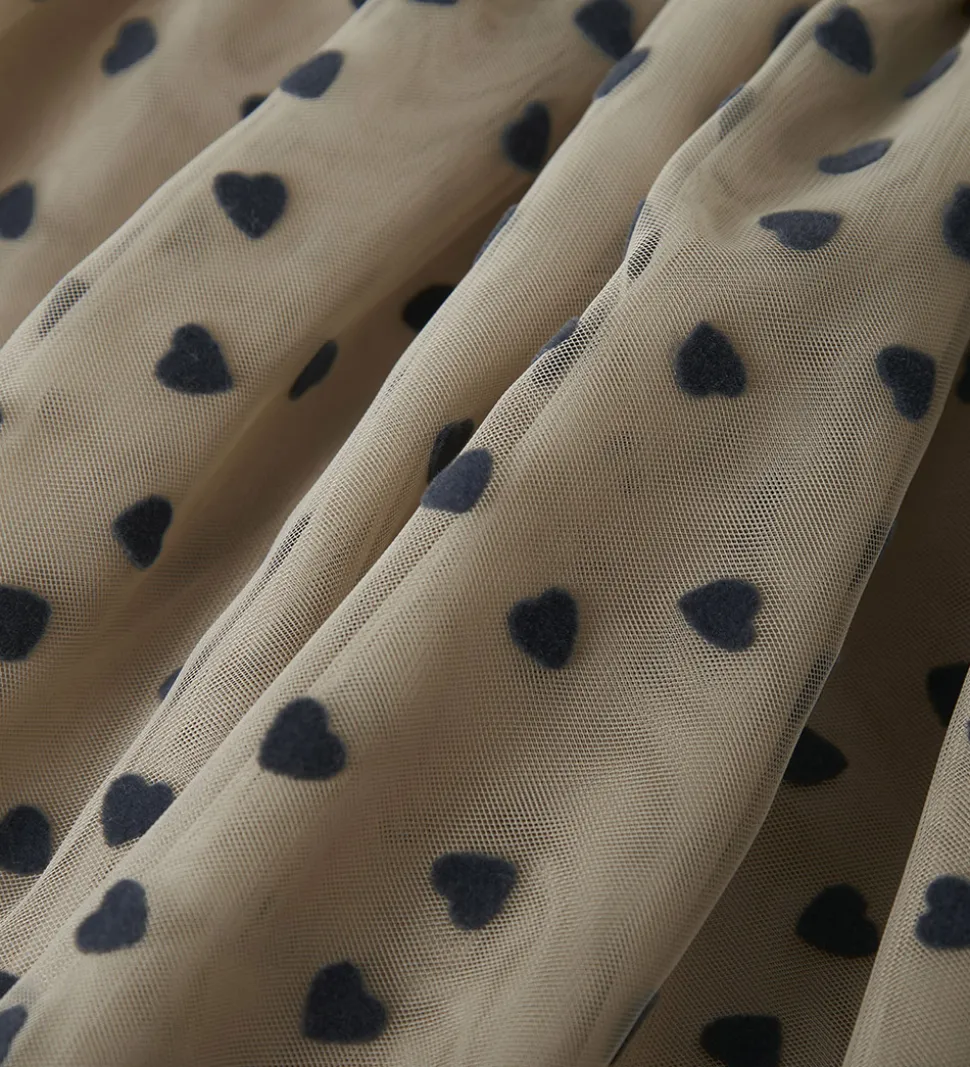 Fin Name It nederdel i en mørk beige med mørkeblå hjerter. Name It nederdelen har en løs pasform og en elastisk talje, der sikre en god pasform.