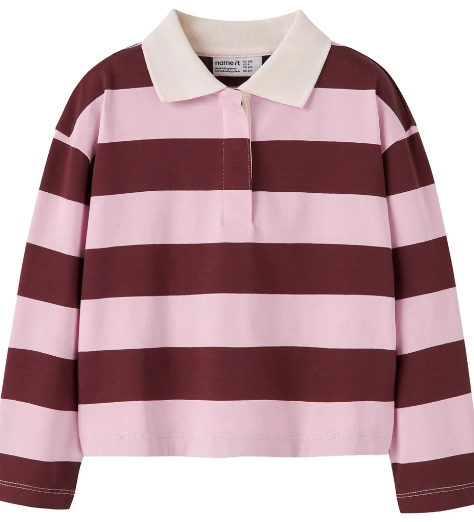 Sej Name It polobluse i stribet rosa og bordeaux. Poloblusen har en hvid krave med skjulte knapper foran og lange ærmer.