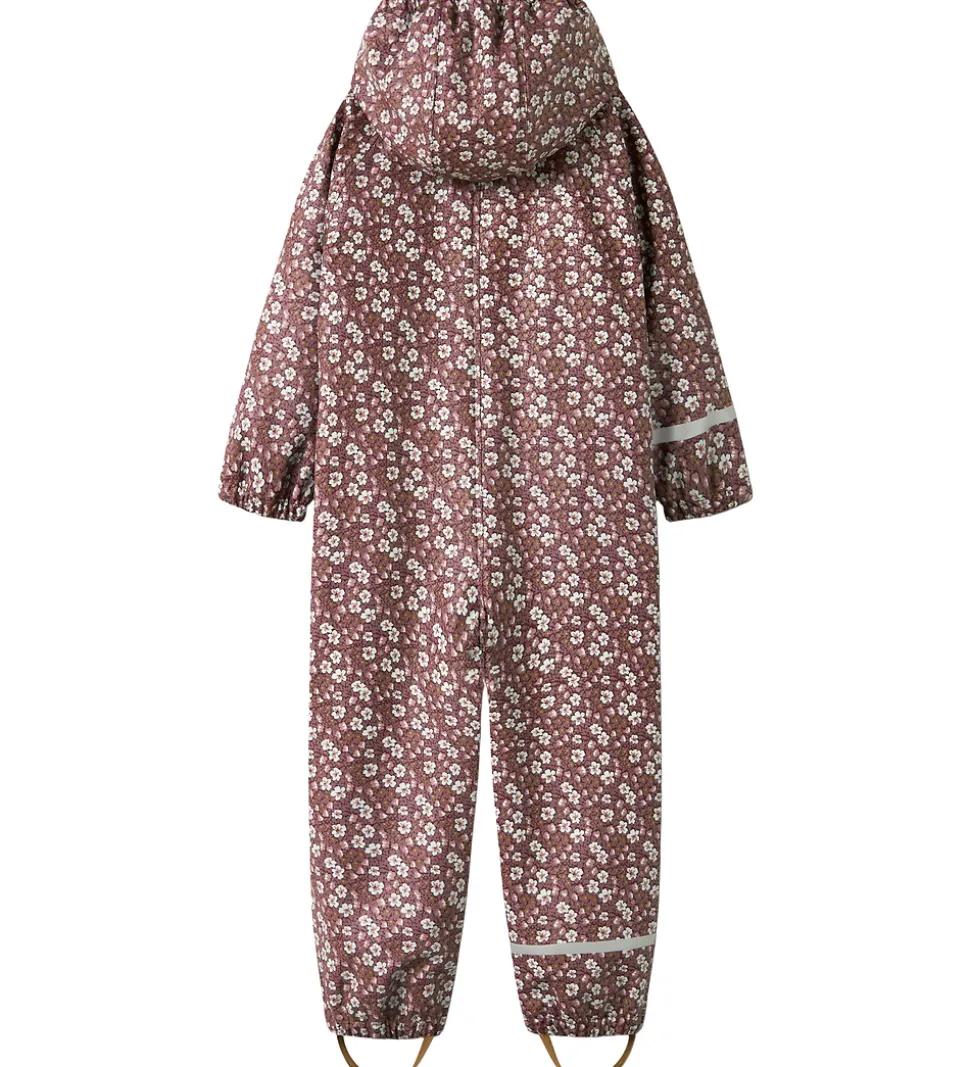 Dejlig Name It regndragt i et småblomstret alloverprint i lilla, rosa og hvid. Regndragten har også diskrete refleks-logoprint.
