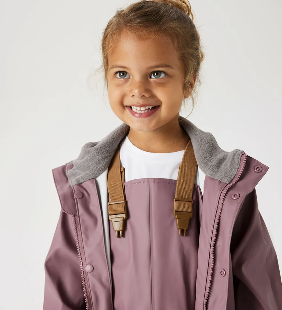 OBS: fra str. 110 (5 år) og opefter er regntøjet med regnbukser uden seler. Regnbukserne har i stedet en indvendigt justerbar elastikkant i livet.