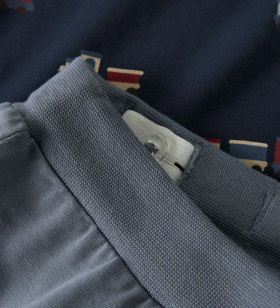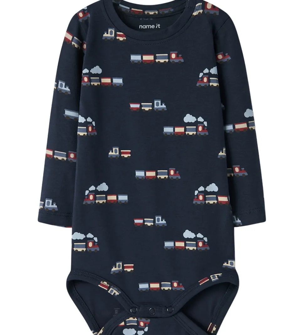 Charmerende Name It sæt bestående af en body og et par bukser i blå nuancer med et mønster af små, farverige tog.