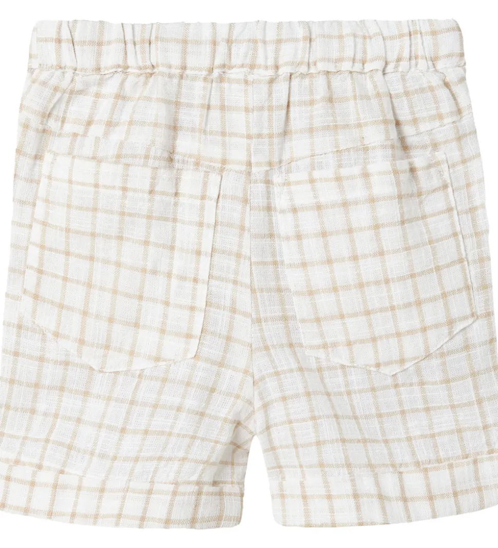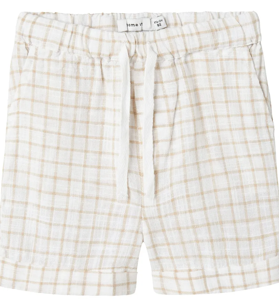 Stilfulde Name It shorts i hvid med et tidløst ternet mønster i beige. Shortsene er designet med en let struktur og et fastsyet ombuk i benåbningerne, som giver et moderne og afslappet look.