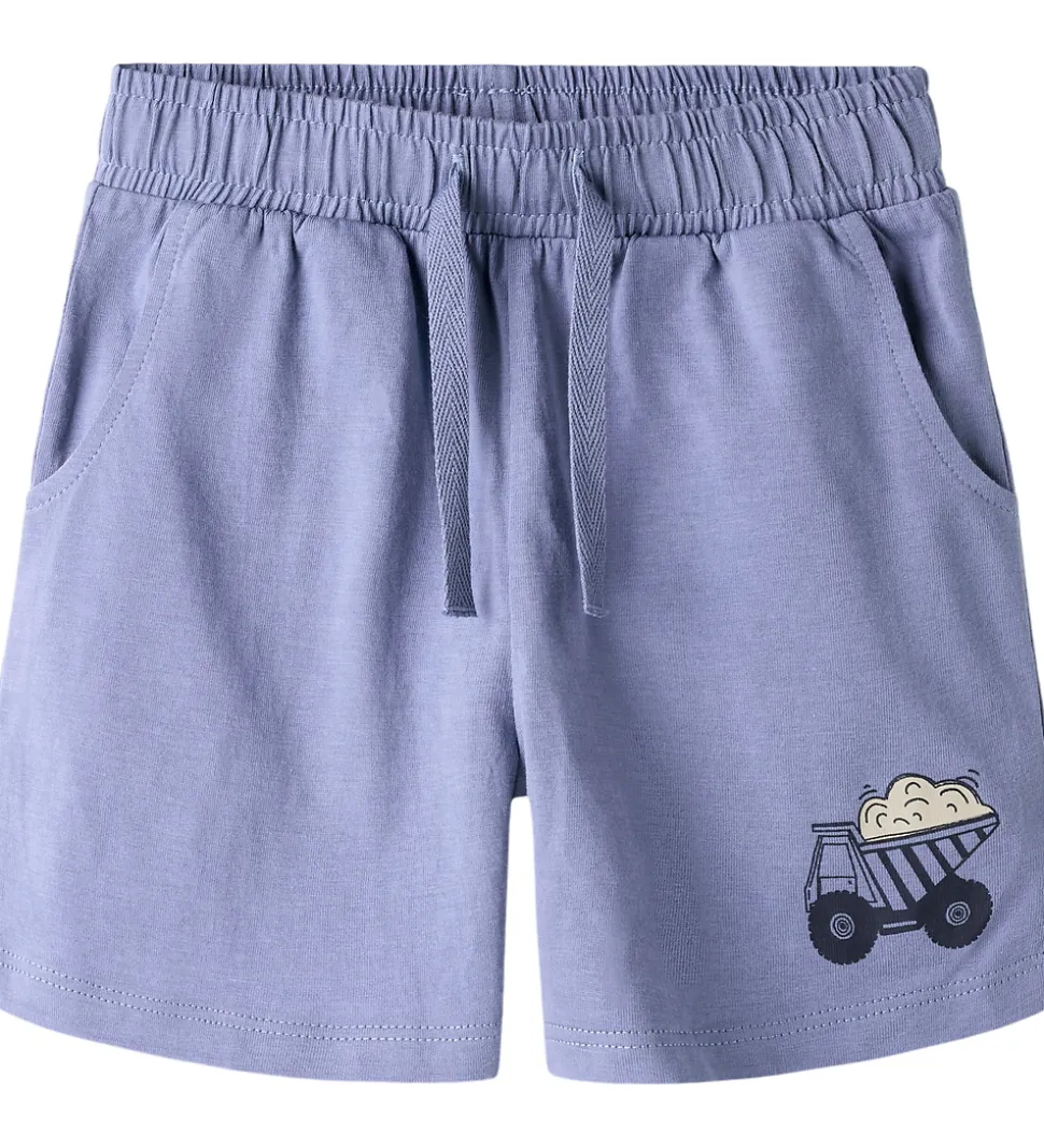 Lækkert Name It shortssæt bestående af et t-shirt og et par shorts. Name It shortsene er i en blød, blå nuance og har en komfortabel elastik i taljen og praktiske snører foran. T-shirten er i navyblå med et spændende transportmiddel-print.
