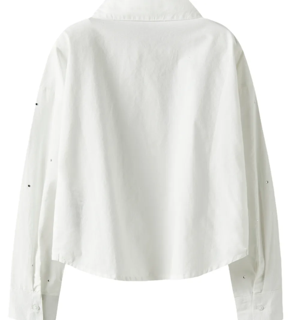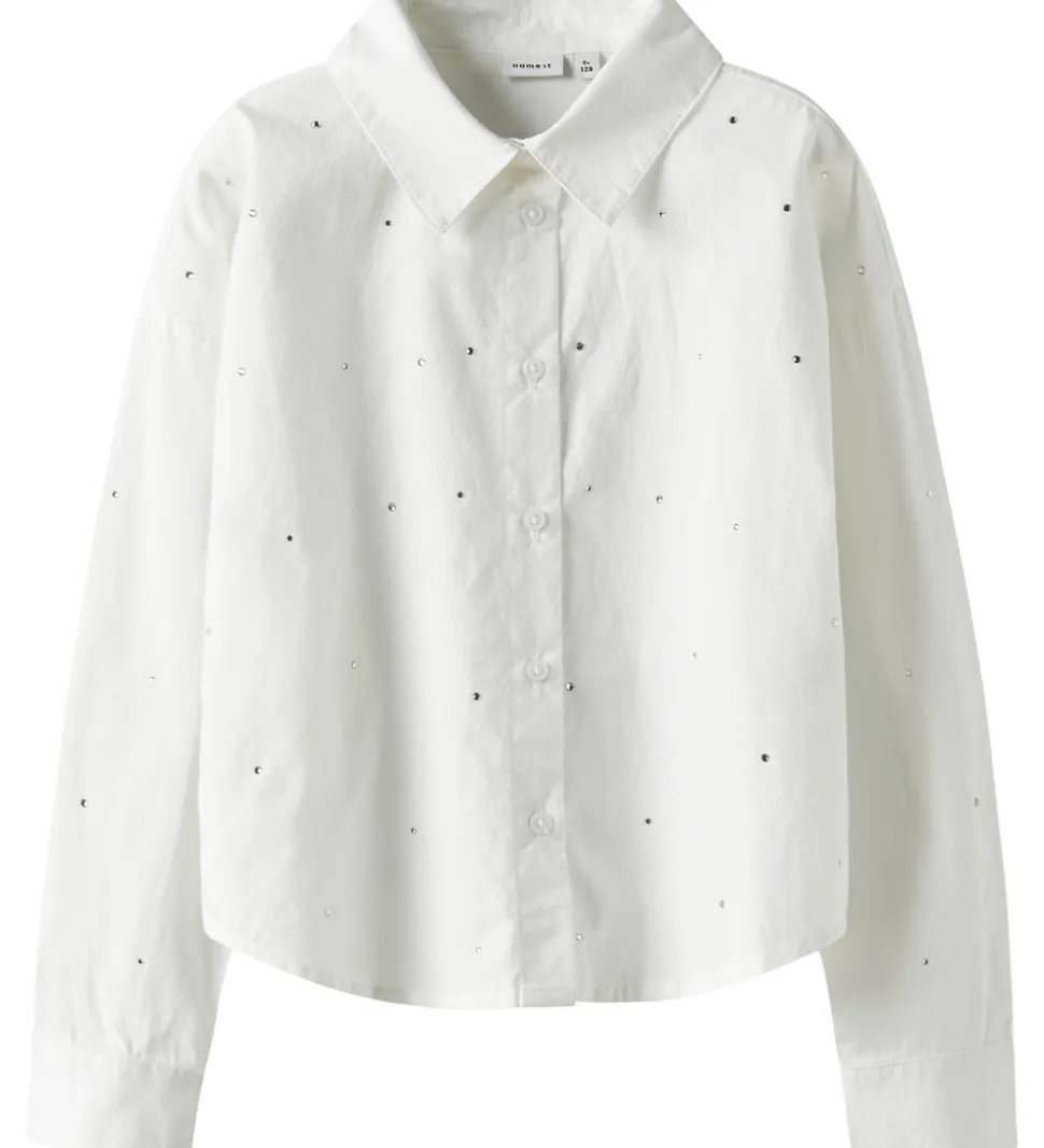 Stilfuld Name It skjorte i hvid med små rhinsten på fronten. Skjorten har en klassisk krave og knapper fortil. Den har lange ærmer med manchetknapper og en boxy pasform.