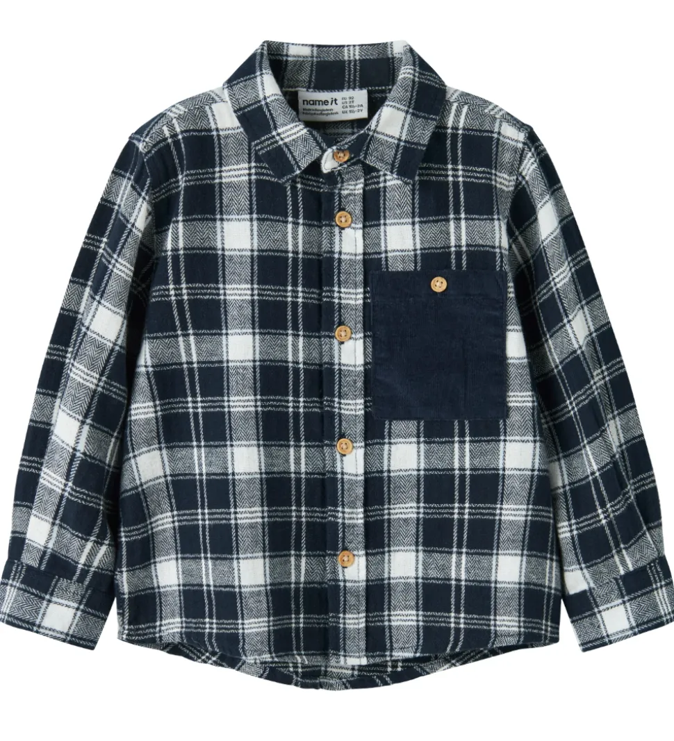 Flot Name It skjorte i et flot ternet mønster i blå og hvid. Skjorten har lange ærmer og en klassisk krave samt en praktisk brystlomme. Den har gennemgående knapper fortil samt manchetknapper ved håndleddene. Skjorten er lavet i en meget blød kvalitet.