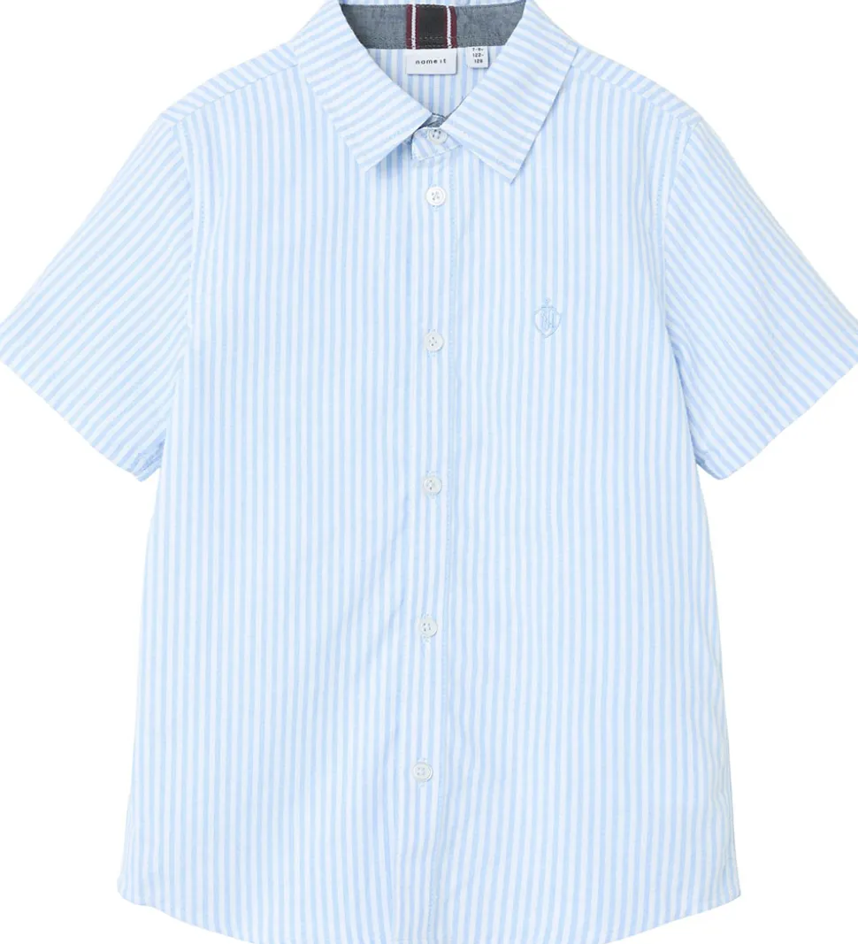 Flot Name It skjorte med korte ærmer i en lys blå farve med fine striber. Skjorten har en klassisk krave og knaplukning, samt en lille logopatch på brystet.