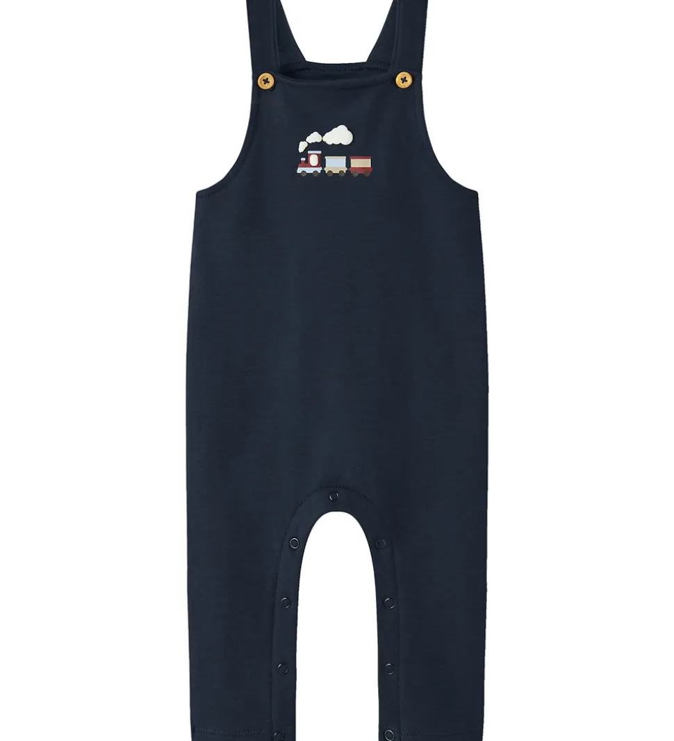 Skønne Name It smækbukser i navyblå sweat med print foran af et tog i forskellige farver.