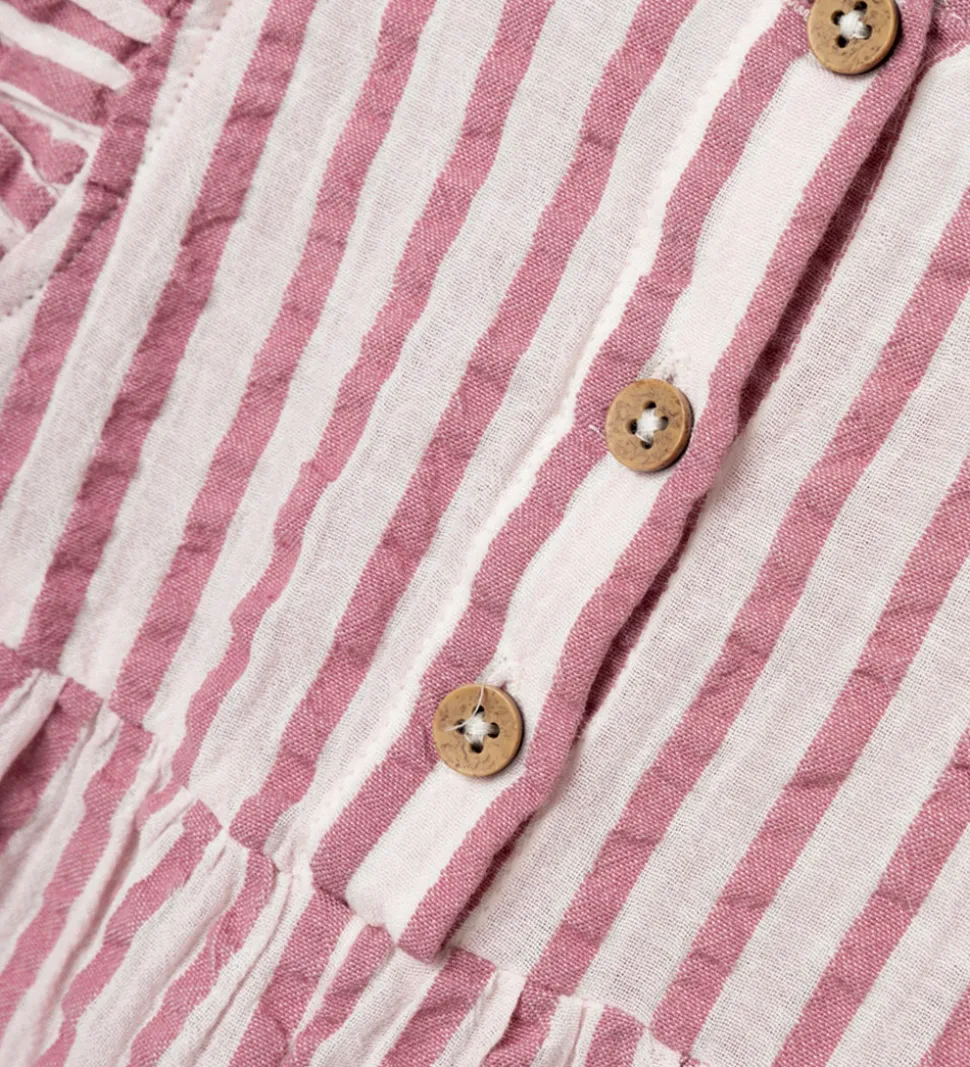 Skøn sommerdragt med lodrette striber i i lys og mørk rosa og med en fin struktur i stoffet.
