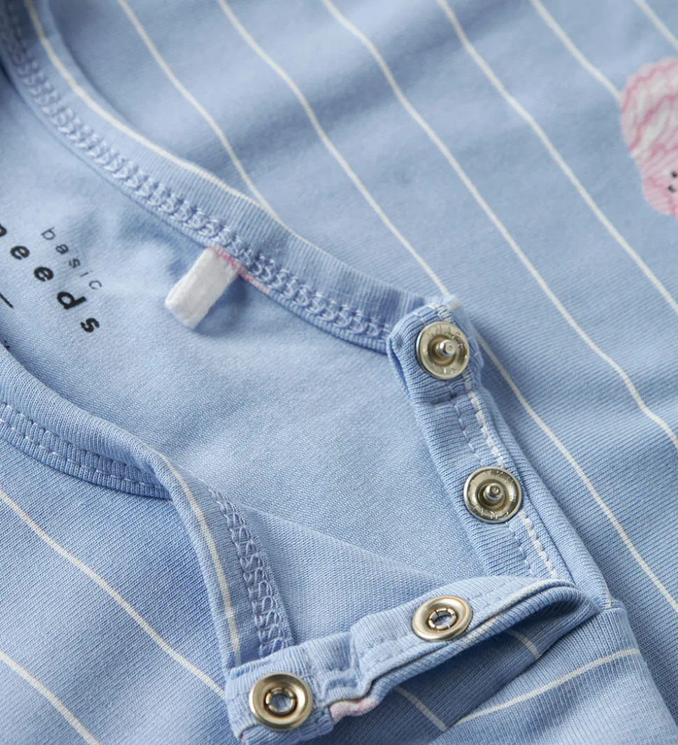 Skøn Name It sommerdragt i en lyseblå farve med smalle, hvide striber. Sommerdragten har et charmerende muslingeprint i lyserød nuancer, der giver et hyggeligt udtryk.