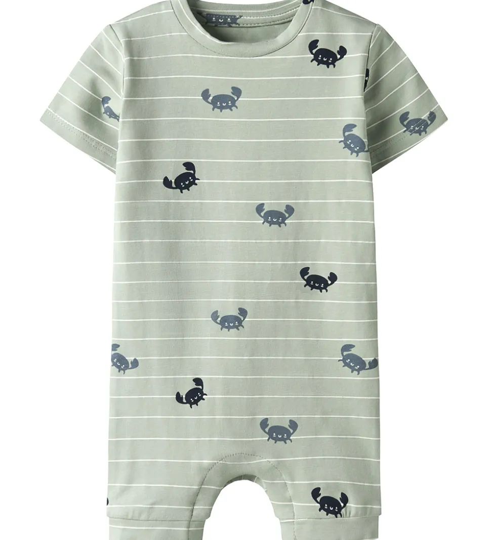 Herlig Name It sommerdragt i en pastel grøn, dekoreret med små krabber og hvide striber. Den afslappede stil gør den ideel til familiens mindste eventyrer.