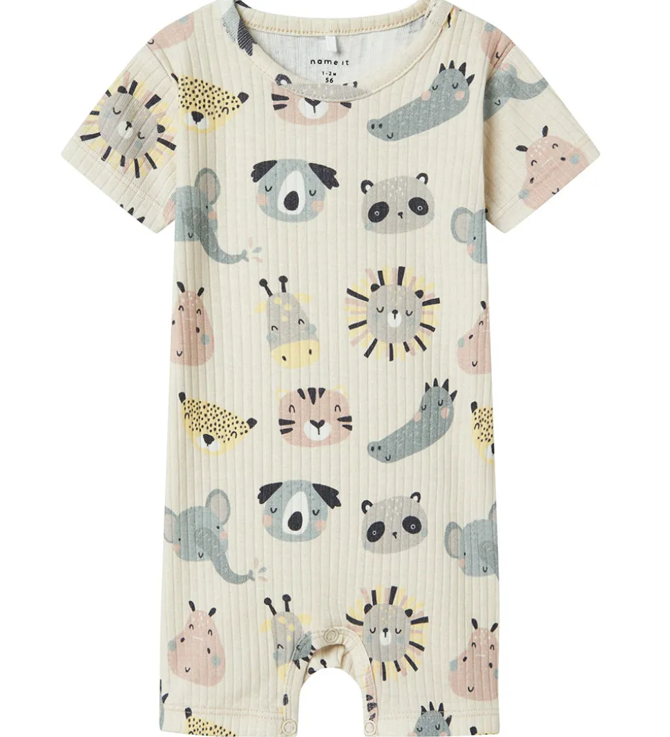 Lækker Name It sommerdragt med ribstruktur og charmerende print af dyrehoveder i forskellige farver. Sommerdragten har korte ærmer og en rund halsudskæring med trykknapper ved venstre skulder. Sommerdragten har korte ben med trykknapper mellem benene.