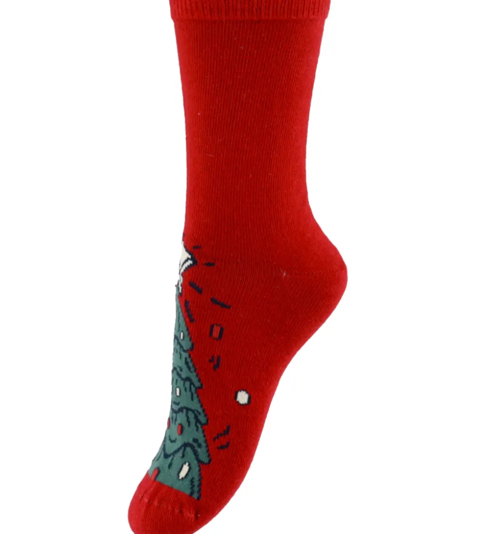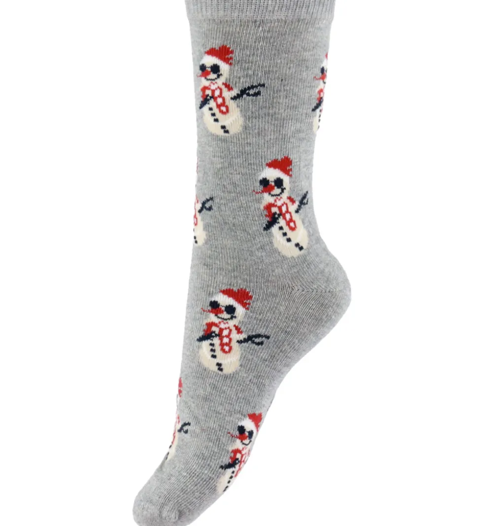 Festlige Name It strømper solgt i en 3-pak i navy med brune peberkagemænd, røde med juletræsmotiv og grå med snemænd. Name It strømperne har en ribkant øverst, som sikrer en god pasform.