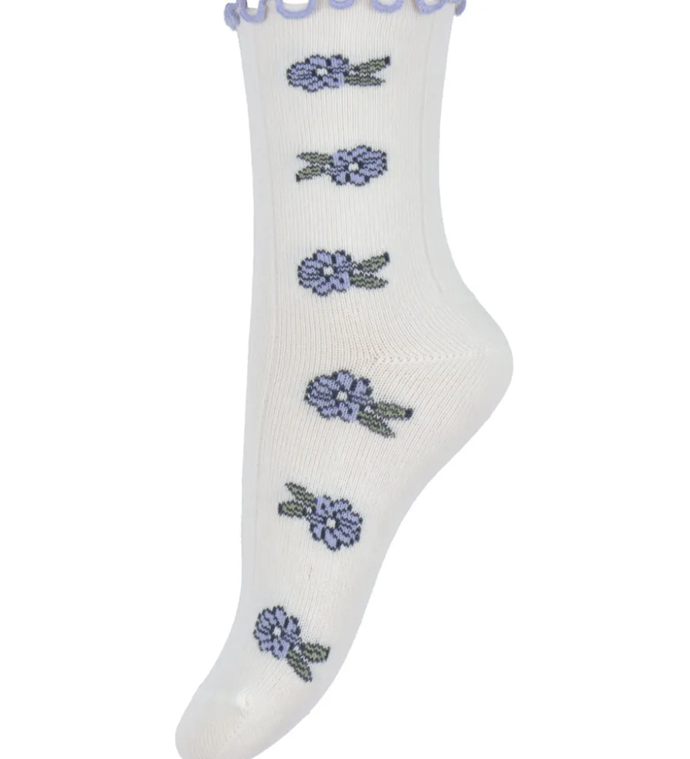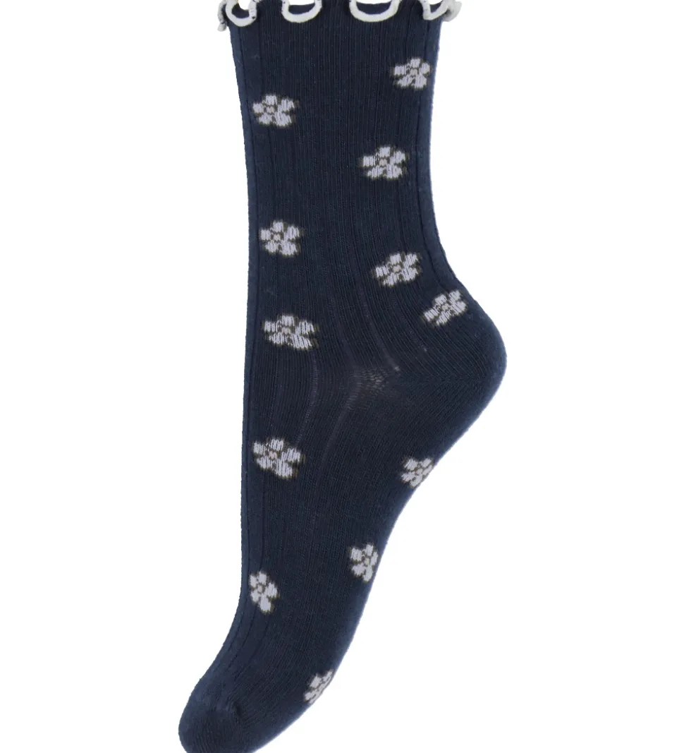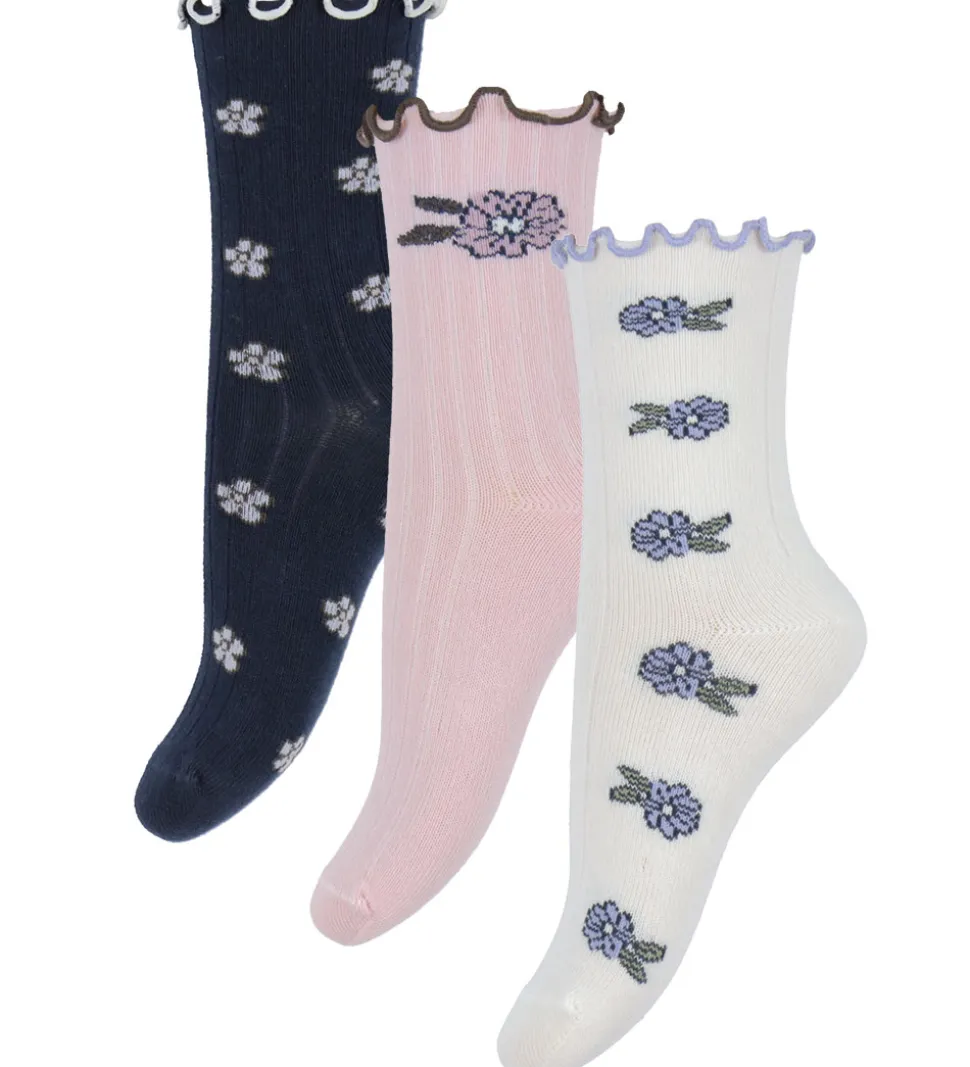 Charmerende Name It strømper i en praktisk 3-pak. De kommer i navy med små blomster, rosa med en stor blomst foran og hvid med blomster i blå nuancer. Name It strømperne har bølgede kanter, der giver et sødt udtryk. Pasformen er sikret med elastik i toppen.