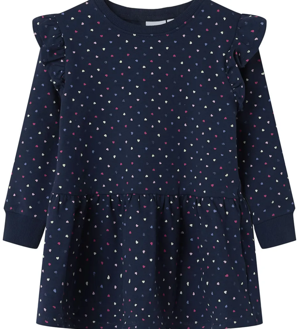 Smart Name It sweatkjole i navyblå med et alloveprint af små hjerter i blå glimmer, pink og hvid. Name It sweatkjolen har lange ærmer med ribkanter og dekorative flæser ved skuldrene. Den har et skørt der giver et fint fald, og indvendigt er der blødt, børstet bomuld.