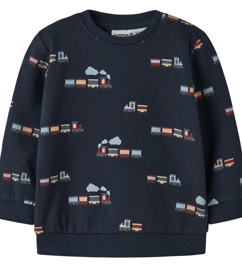 Skøn Name It sweatshirt i navyblå med et fint togprint i forskellige farver. Name It sweatshirten har lange ærmer og en rund halsudskæring med trykknapper ved venstre skulder. Indvendigt er der blødt, børstet bomuld.