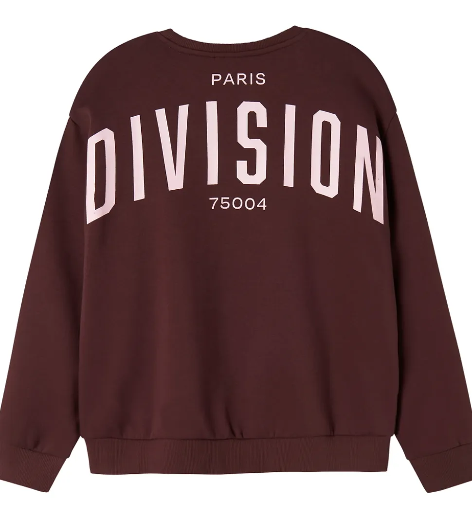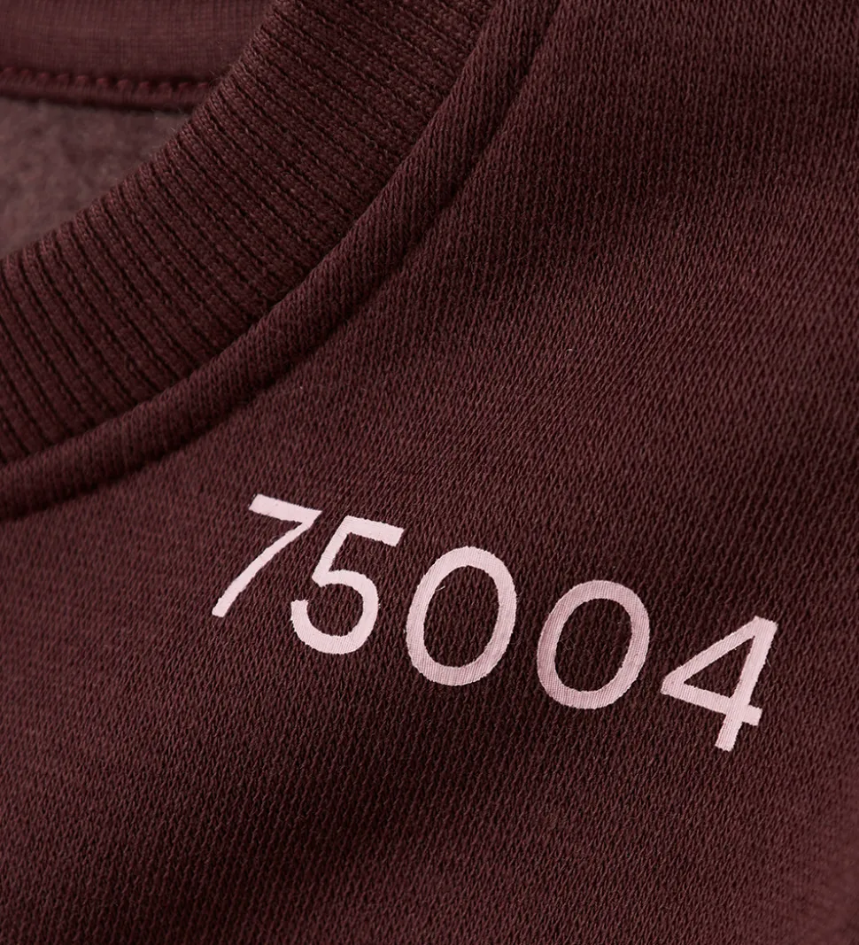 Elegant Name It sweatshirt i bordeauxrød med tallene “75004” printet i rosa øverst i venstre side. På ryggen er der et stort, rosa print med teksten “Paris Division 75004”. Name It sweatshirten har en klassisk rund halsudskæring og lange ærmer med ribkanter. Indvendigt er der blødt, børstet bomuld.