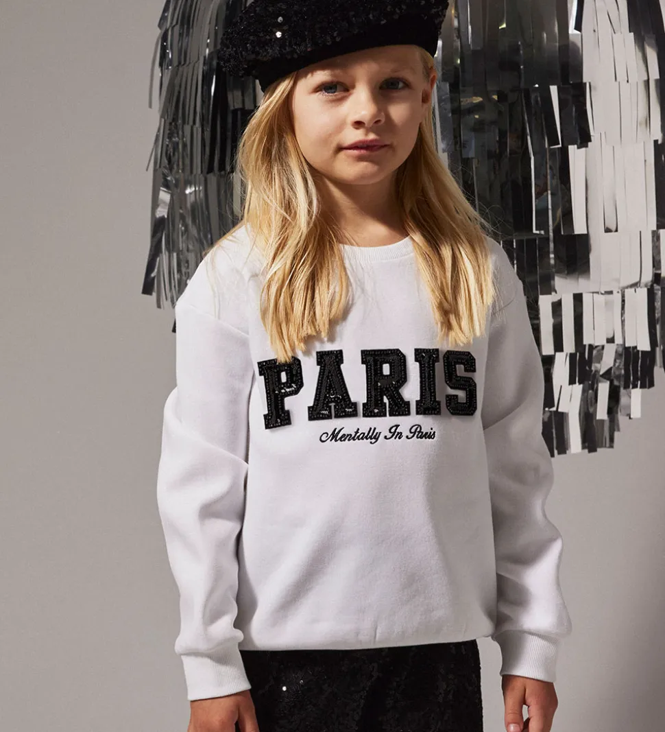 Stilfuld Name It sweatshirt i hvid med teksten “Paris” i sorte palietter og perler og “Mentally In Paris” broderet i sort nedenunder. Name It sweatshirten har lange ærmer og rund hals. Indvendigt er der blødt, børstet bomuld.