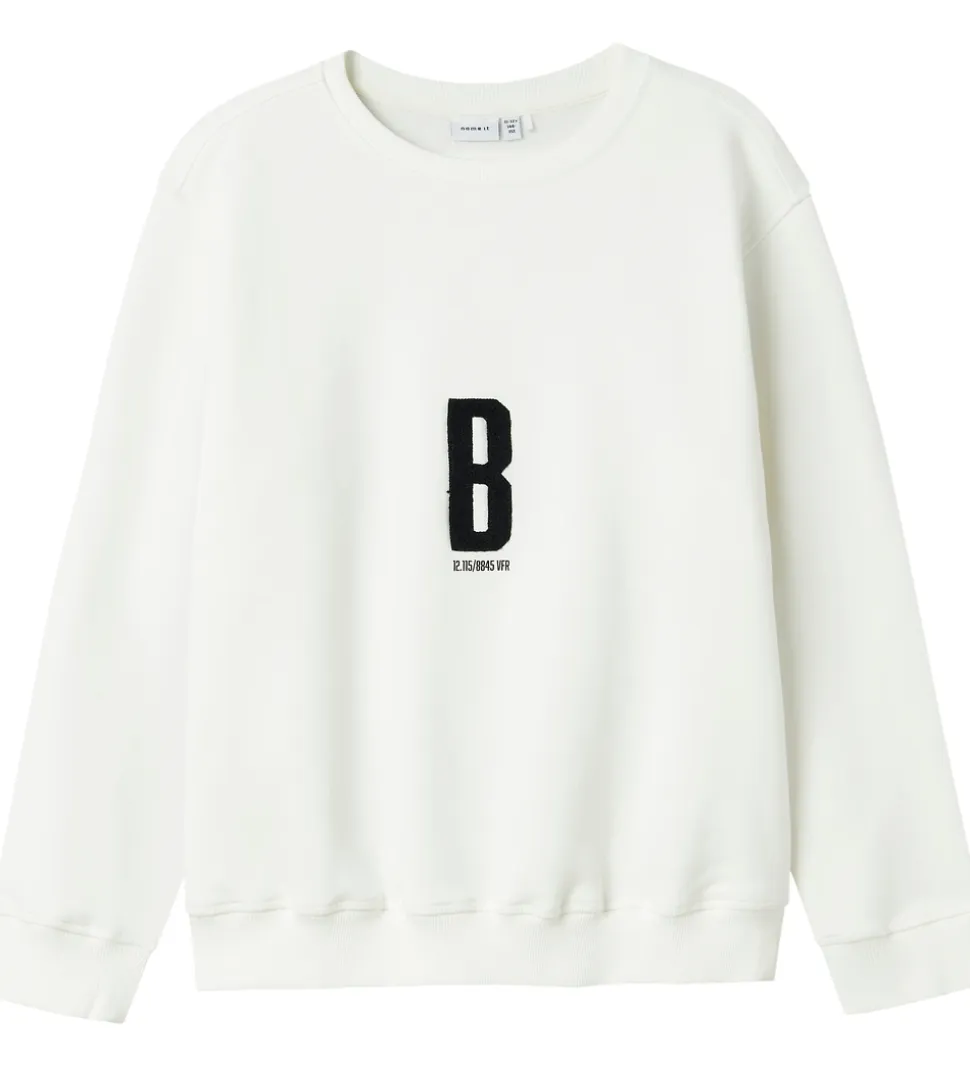 Stilren Name It sweatshirt i hvid med et sort “B” i frotté på fronten samt sort tekstprint. På ryggen er der et sort “9” i frotté. Name It sweatshirten har en rund halsudskæring og lange ærmer med ribkanter. Indvendigt er der blødt, børstet bomuld.