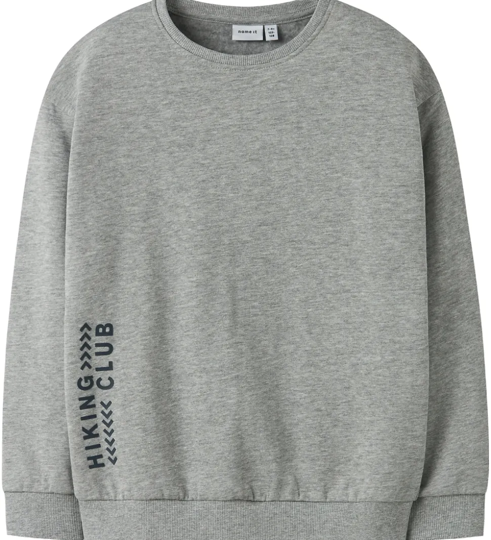 Stilfuld Name It sweatshirt i meleret grå, med et stort print på ryggen af bjerge og ikoner. Name It sweatshirten har en rund hals og lange ærmer. Den har et diskret “Hiking Club” print langs siden, hvilket tilføjer en moderne detalje.