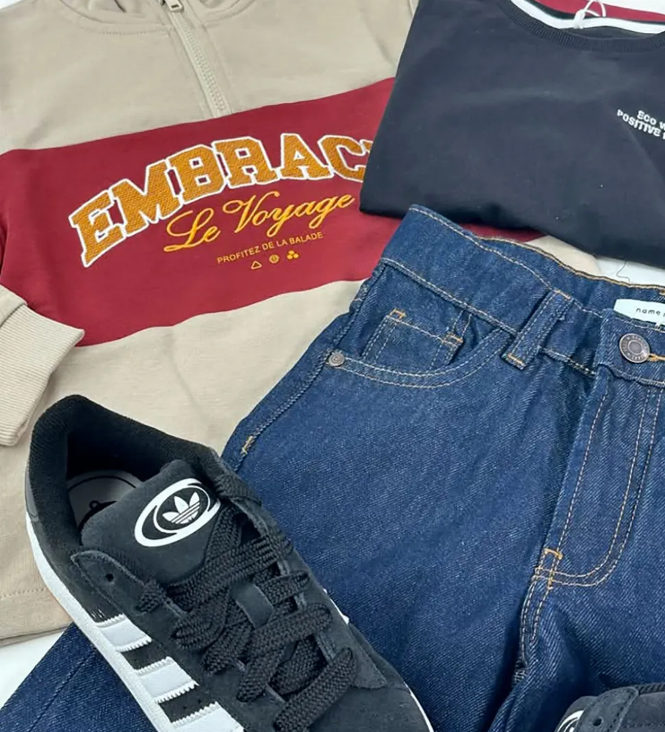 Sporty Name It sweatshirt i beige med en bred, rød stribe på midten med teksten “Embrace Le Voyage” broderet i orange. Name It sweatshirten har en mellemhøj krave med en kort lynlås fortil. Den har lange ærmer med brede ribkanter i ærmeåbningerne. Indvendigt er der blødt, børstet bomuld.